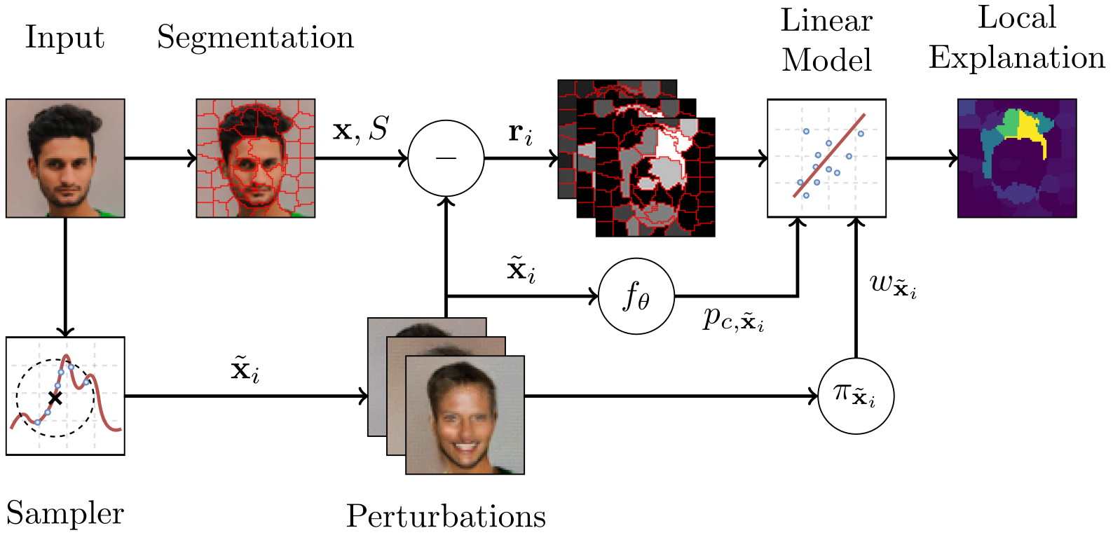 The figure above shows the methodology of POMELO. First, the input is segmented. In parallel, a neural sampler generates full-input perturbations of the input. The segment-wise differences and the changes in the softlabels are then used to train a linear surrogate model. The weights of this model serve as the importance scores of the associated segments, mapping to sets of pixels. The critical difference to LIME is that we allow full-input perturbations instead of perturbing random segments. Therefore our method captures big and distant correlations more constistently.